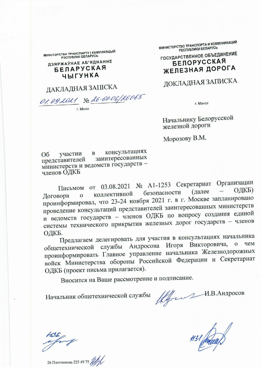 23-24 ноября 2021г. в Москве запланировано проведение консультаций представителей заинтересованных министерств и ведомств государств — членов ОДКБ по вопросу создания единой системы технического прикрытия железных дорог государств — членов ОДКБ.
